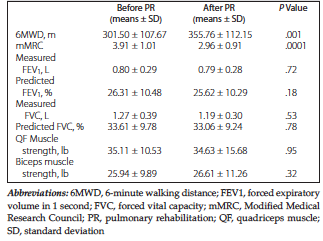 Table 2 shows functional parameters (6MWD, mMRC) after PR program and change from baseline. Significant improvements were observed in 6MWD (P = .001) and mMRC dyspnea scores (P = .001). With no statistical difference, there was a slight decrease in the mean results of lung functions. There were no statistically significant differences in quadriceps femoris (QF) (P = .95) and biceps muscle strength (P = .32).