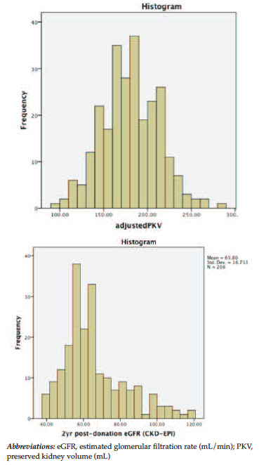 We identified and included 208 donors who had valid CT volume measurements during the study period. Baseline demographics of all donors are shown in Table 1. The distribution frequency of adjusted PKV is shown in Figure 1A. The mean and median pre- and postdonation eGFR (determined with CKD-EPI) box plots are shown in Figure 2, and the distribution frequency of 2-year eGFR is shown in Figure 1B.