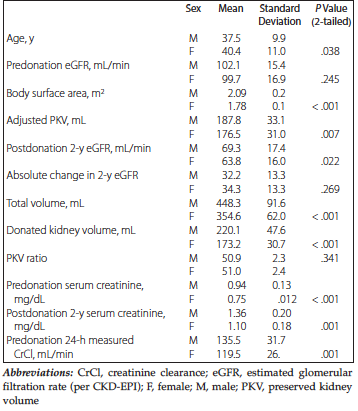 There were notable significant expected dif-ferences between male and female donors and donor volumes as shown in Table 2. However, we observed no significant differences between predonation eGFR (determined with CKD-EPI) of men and women versus their absolute change in eGFR at 2 years. No significant difference was shown in adjusted PKV versus side of nephrectomy (mean left nephrectomy volume of 179 ± 31 mL vs right nephrectomy volume of 183.2 ± 33 mL; P = .32).