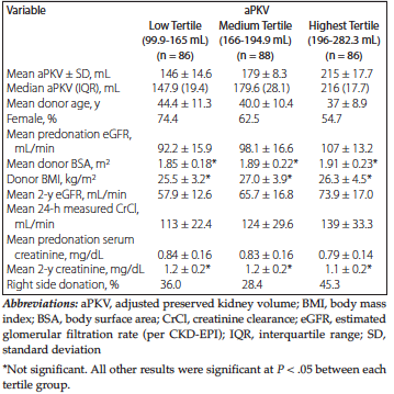 Table 5. Donor Characteristics and Renal Function Shown by Adjusted Preserved Kidney Volume Tertile Groups