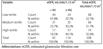Further subanalysis was done to assess the strength of the prediction and correlation between adjusted PKV and remaining renal function by dividing the study population of donor adjusted PKV into tertiles (low, medium, and high; Figure 4). Detailed donor variables of the tertile groups are presented in Table 5. Predonation and 2-year postdonation serum creatinine levels, BSA, and body mass index did not differ significantly between the 3 tertile groups. However, predonation eGFR and 2-year postdonation eGFR (both determined with CKD-EPI) were significantly correlated with each tertile group, along with age, female sex, and 24-hour measured creatinine clearance. Patients in each adjusted PKV tertile were then cross-tabulated with eGFR < 60 or ≥ 60 mL/min (Table 6). We observed a significantly higher proportion of donors in the lowest tertile group with eGFR < 60 mL/min (47.8% vs 20.7%; P < .05) and a significantly lower proportion of donors with eGFR of < 60 mL/min in the highest tertile group (18.5% vs 49.1%; P < .05). There was no significant difference in proportions of donors in the middle tertile group.