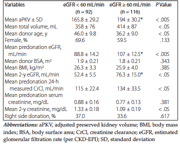 Key variables were also subanalyzed by dividing donors with 2-year eGFR data (per CKD-EPI) into 2 groups: those with eGFR < 60 mL/min and those with eGFR ≥ 60 mL/min (Table 7). Those with 2-year eGFR < 60 mL/min had significantly lower adjusted PKV (165 ± 29 mL) than those with 2-year eGFR ≥ 60 mL/min (mean adjusted PKV = 194 ± 30 mL).