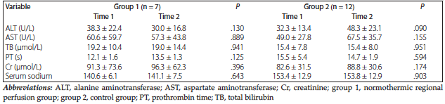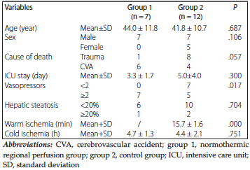 In the donor groups, WIT for group 2 was 15.7 ± 1.6 minutes (range, 14-19 min). It was not possible to record the WIT for group 1 due to the unpredictable period of the hypotensive phase. No significant differences were found in CIT between the 2 groups (4.7 ± 1.3 h for group 1 vs 4.4 ± 2.1 h for group 2; P = .751).