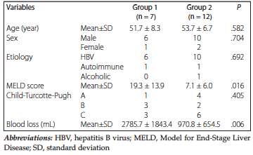 With regard to recipient groups, no significant differences were found in age, sex, reason for transplant, and Child-Turcotte-Pugh score in group 3 versus group 4 (P > .05; Table 3). However, the MELD score was significantly higher in group 3 than in group 4 (P = .016), and a relatively higher level of blood loss during surgery was also noted in group 3. All patients were recipients of a first transplant in this study.