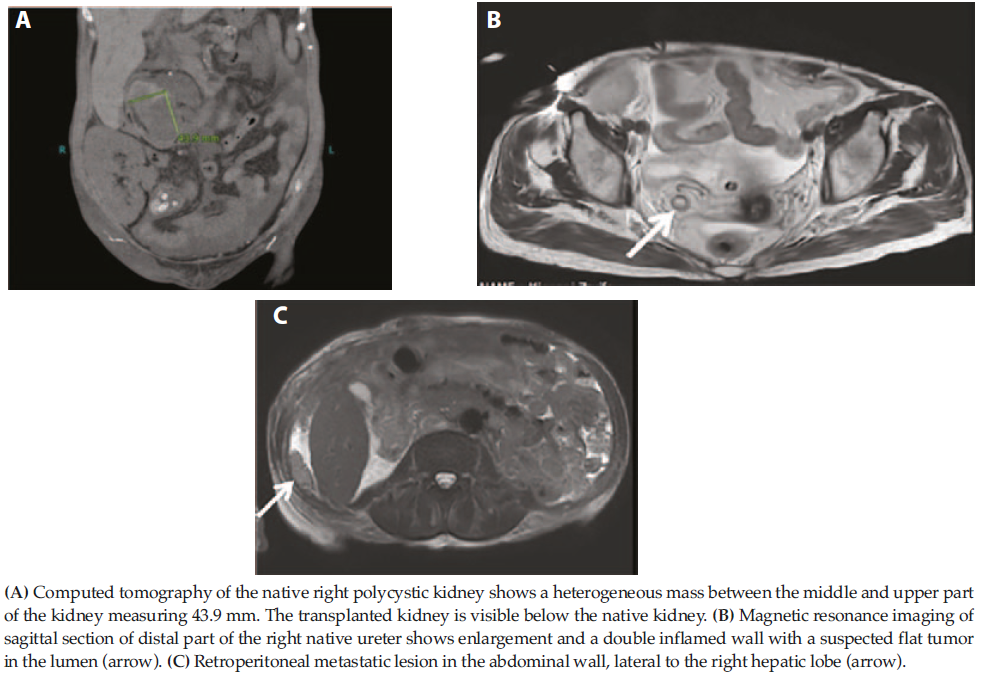 The most important factor favoring the development of renal cell carcinoma in kidney transplant recipients is a long-term regimen of immunosuppression. The administration of calcineurin inhibitors and mycophenolate mofetil certainly favored the development of malignancy in our case, together with chronic inflammation and urinary obstruction. The patient had received cyclosporin A treatment for more than 10 years, with addition of tacrolimus for the last 6 years. Cyclosporin A is thought to favor carcinogenesis to a higher degree than tacrolimus.14 In our case, we first performed radical ablation of the native kidney, followed by a second step of ureterectomy with elimination of 2 major secondary retroperitoneal masses. Hematuria ceased immediately and the patient’s condition began to slowly improve. We found local invasion from the renal pelvis to the renal veins and arteries in the destroyed renal parenchyma but not in the perirenal space and fat tissue. However, the presence of 2 metastases showed that the initial process was very aggressive. The presence of ascites with a mucinous mass in the recto-uterine Douglas space containing high-grade malignant cells confirmed the advanced stage of the disease. Surgical removal is the only recommended treatment modality in such cases.12