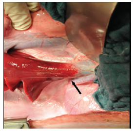 Figure 3. The prepared infrahepatic inferior vena cava (arrow).