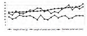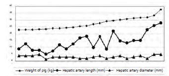Results: Pearson tests showed a clear correlation between the increase of the pigs’ weight and the livers’ weight, and the length of the vessels and the bile ducts. We did not find a clear correlation between the increase of the pigs’ liver weight and the diameters of the vessels and the bile duct.