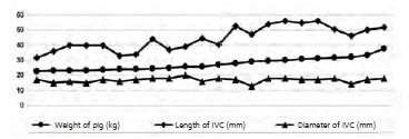 Figure 7. Relation between the length and diameter of the inferior vena cava with the weight of the pigs.