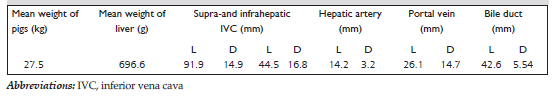 Materials and Methods: Landrace pigs (n=22, 23 to 37 kg) underwent a laparotomy under general anesthesia. The hepatic hilum was prepared and the common bile ducts, common hepatic artery, portal vein, supra- and infrahepatic inferior vena cava were identified. The length and diameter of each vessel and bile duct and the weight of the liver were measured.