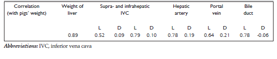 Table 2. Pearson correlation between weight of the pigs and weight of the livers as well as vascular and bile duct parameters regarding the length (L) and the diameter (D) of the remaining structures.