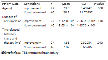 Results: Fourteen days after cell therapy, no serious complications or adverse events were reported. To a certain extent, 38 of 97 patients (39.2%) improved in the function of brain after transplant (P = .007). Eleven of 24 patients (45.8%) with persistent vegetative state showed posttherapeutic improvements in consciousness (P = .024). Twenty-seven of 73 patients (37.0%) with a motor disorder began to show improvements in motor functions (P = .025). The age of patients and the time elapsed between injury and therapy had effects on the outcomes of the cellular therapy (P < .05). No correlation was found between the number of cell injections and improvements (P > .05).