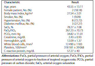 Six of the 11 patients (54%) with ARF had pneumonia. When chest radiography scans were evaluated, areas of pneumonic infiltration were observed in at least 3 lung zones. Respiratory secretion samples of 1 patient who was diagnosed with pneumonia were taken by fiberoptic bronchoscopy, and 3 samples were taken by tracheal aspirate. On sputum, deep tracheal aspirate, and bronchial lavage samples, Klebsiella pneumonia (n = 2), Acinetobacter species (n = 1), Proteus mirabilis (n = 1), or no microorganisms (n = 2) were detected. Besides pneumonia, other causes of ARF were cardiogenic pulmonary edema (n = 2), ARDS (n = 2; due to acute pancreatitis and acute cerebrovascular thromboembolism), and exacerbation of chronic obstructive pulmonary disease (n = 1).