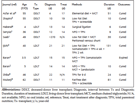 In conclusion, chylous ascites is a rare complication after liver transplant. Most reported cases are diagnosed within 1 postoperative month. Preoperative poorly controlled ascites or application of the LVSS during dissection, especially in hilar region, increase the risk of postoperative chylous ascites. Sirolimus also should be carefully used or avoided, especially in the early posttransplant days in high-risk patients. The cause of chylous ascites after a liver transplant should be multifactorial, and all possible risk factors should be considered and a multidisciplinary approach is necessary for excellent results.