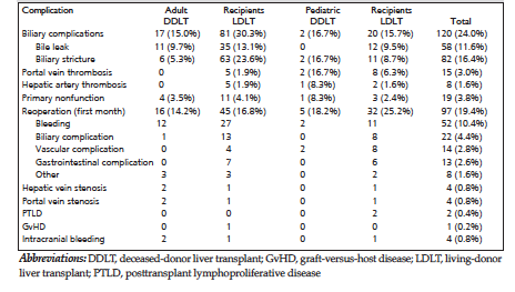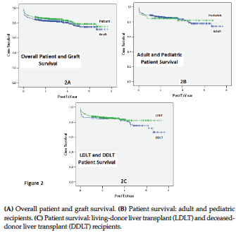 The mean age of deceased donors was 10.5 years (range, 0.4 to 32 y) for pediatric patients and 42.9 years (range, 7 to 80 y) for adults. There were 54 female deceased donors (43.2%) and 71 males (56.8%). Mean BMI of deceased donors was 24.5 kg/m² (range, 13.7 to 56.2 kg/m²). Mean age of living donors was 34.0 years (range, 18 to 61 y), mean BMI was 32.3 kg/m² (range, 17.5 to 40 kg/m²), and 177 living donors (44.9%) were female. Only 2.8% (n = 11) living donors were unrelated to the recipient. Mean cold ischemia time for DDLT was 6.7 hours (range, 3 to 17 h) and for LDLT was 1.3 hours (range, 0.3 to 7 h). Mean duration of operation was 7.9 hours (range, 3.5 to 17.3 h), and mean blood transfusion was 1.6 units (range, 0 to 22 units) during pediatric LT and 8.6 units (range, 0 to 81 units) during adult LT. Median ICU stay was 2 days (range, 1 to 125 d), and median hospital stay was 15 days (range, 7 to 207 d).