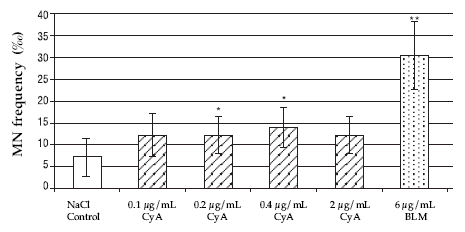 Addition of 0.2 and 0.4 µg CyA/mL effected a slightly significant increase (P < 0.05) of the MN frequencies (Figure 1), while the BLM-positive control increased the MN frequency significantly (P < 0.01).