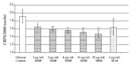 Figure 2. CBPI after in vitro treatment with different MMF concentrations. (*) significant at the level P < 0.05; (**) significant at the level P < 0.01; MMF: mycophenolate mofetil; BLM: bleomycin
