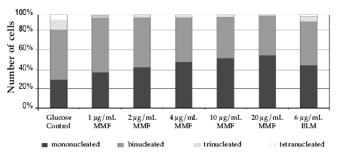 Figure 3. Distribution of mono-, bi-, tri- and tetranucleated cells in lymphocyte cultures after treatment with different MMF concentrations. MMF: mycophenolate mofetil; BLM: bleomycin