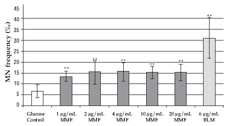 Figure 4. MN frequencies in binucleated cells after in vitro treatment with different MMF concentrations. (**) significant at the level P < 0.01; MMF: mycophenolate mofetil; BLM: bleomycin