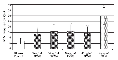 Figure 5. MN frequencies in binucleated cells after in vitro treatment with different FK506 concentrations. (*) significant at the level P < 0.05; (**) significant at the level P < 0.01; FK506: tacrolimus; BLM: bleomycin