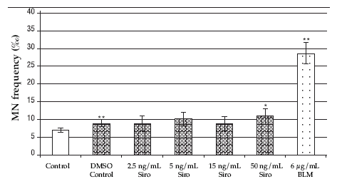 Figure 6. MN frequencies in binucleated cells after in vitro treatment with different sirolimus concentrations. (*) significant at the level P < 0.05; (**) significant at the level P < 0.01; Siro: sirolimus; BLM: bleomycin