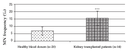 Figure 7. MN frequencies in binucleated cells in healthy blood donors and patients after kidney transplantation. (***) significant at the level P < 0.001