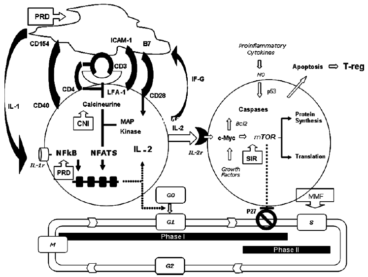 Figure 1. Molecular pathways involved in transplant rejection. Note the sites of action of corticosteroids (PRD) and calcineurin inhibitors (CNI) during