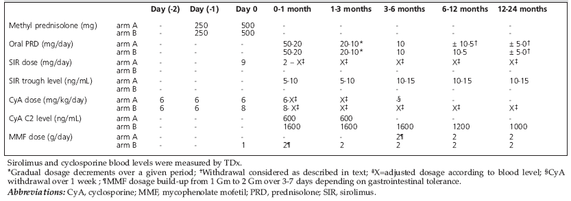 Acute rejection was diagnosed by graft biopsy, scored according to Banff criteria, and treated with methylprednisolone in 500-mg pulse doses daily for 6 to 8 days. Steroid-resistant rejections were treated with rabbit anti-thymocyte globulin for 14 days. Following control of the rejection, arm-A patients in phase 1 were not switched to phase 2 for at least 3 months, while those in phase 2 received additional cyclosporine in small doses and were kept on quadruple therapy for at least 3 months.