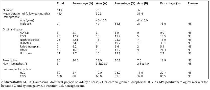 In total, 113 de novo transplants were enrolled in the study. They were sequentially assigned in a 2:1 succession either to arm A (76 patients) to arm B (37 patients) as described in Table 1.