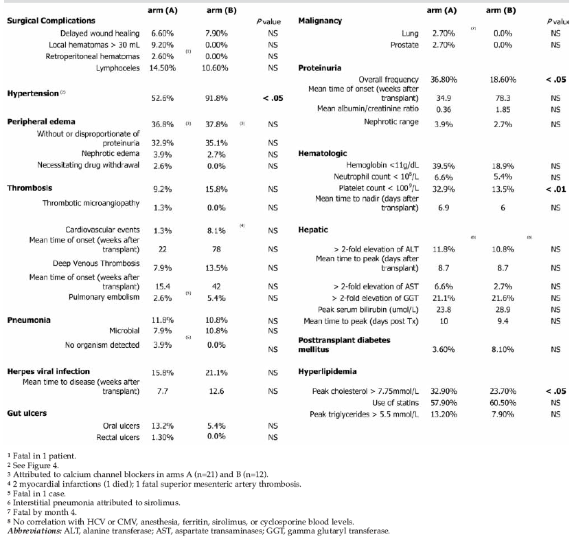 By the end of 2 years, owing to delayed wound healing, gross edema, delayed graft function, shortage of funds (2 patients each), interstitial pneumonia, rectal ulcerations, and difficulty in achieving therapeutic drug levels owing to the use of oral anticoagulants (1 patient each), sirolimus was withdrawn in 11 patients in arm A (14.5%) after a mean of 6.7 months (range, 0.7-15 months). Conversely, owing to significant cyclosporine adverse effects, 8 patients in arm B (21.1%) were switched to sirolimus after a mean of 4.3 months (range, 1.0-10 months).