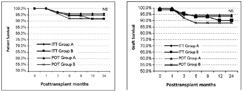 Figure 2. Intent-to-treat Kaplan-Meier curves: (A) patient survival; (B) uncensored graft survival. Abbreviations: ITT, intent-to-treat; POT, patients-on-therapy analysis