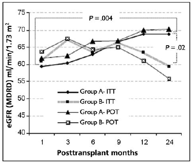 On patients-on-therapy analysis, serum creatinine levels at 24 months showed a progressive decline in patients in arm A to a mean of 96.8 µmol/L (1.1 mg/dL) compared with 126.72 µmol/L (1.44 mg/dL) in patients in arm B (P = .001). This reflected on the eGFR which, in patients in arm A, showed a statistically significantly progressive rise from 61.85 ± 10.45 mL/min/1.73 m2 at baseline to 70.2 ± 8.0 mL/min/1.73 m2 at 2 years (P = .024), while it showed a numerical (although not statistically significant) decline in patients in arm B from 63.77 ± 8.9 mL/min/1.73 m2 to 55.86 ± 7.8 mL/min/1.73 m2 (P = .065). The eGFR at year 2 (Figure 3) was statistically significantly higher in patients in arm A than in those in arm B (P = .03). Similar conclusions were made by intent-to-treat analysis as shown in Figure 3.