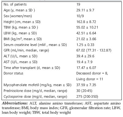 Conclusions: Our results demonstrate that total body weight, time after transplant, and mycophenolate mofetil dosage according to body weight affect mycophenolic acid pharmacokinetics. We suggest that mycophenolic acid pharmacokinetics monitoring is necessary to individualize mycophenolate mofetil dosing during the early posttransplant period.