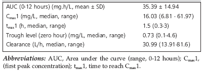 The patients’ characteristics are summarized in Table 1. In patients given mycophenolate mofetil (1 g b.i.d.), the AUC (range, 0-12 hours) was 11.52 to 66.95 mg.h/L, which showed individual variability during the early posttransplant period. The first peak concentration (Cmax1) was achieved rapidly with tmax1 at a range of 0.3 to 3. There was a second peak concentration (Cmax2) in the AUC of 13 patients within 6 to 10 hours (tmax2) after administration of mycophenolate mofetil. The mean value ± SD of Cmax2, which was 1.98 ± 1.89, was attributed to enterohepatic recirculation. In our study, enterohepatic recirculation contributed to 22% of the AUC (range, 0-12 hours) and may have had a role in interindividual pharmacokinetics variability. A summary of the pharmacokinetics of mycophenolic acid is provided in Table 2.