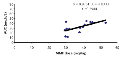 Figure 2. Correlation ofmycophenolatemofetil (MMF) dosage by body weight (in mg/kg) with area under the time-concentration curve (AUC).
