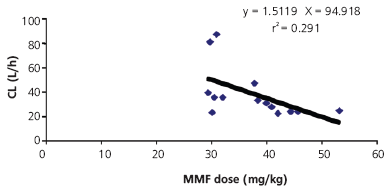 Figure 3. Correlation between mycophenolate mofetil (MMF) dosage by body weight (in mg/kg) with clearance (CL).