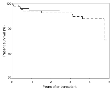 Figure 2. Kaplan-Meier estimate of allograft survival. Outcomes for the steroid-avoidance group (solid line) and the maintenance group (dashed line) are similar (P = .94, log rank).