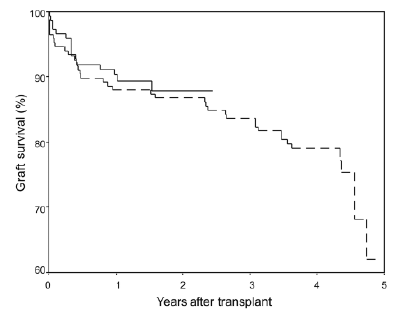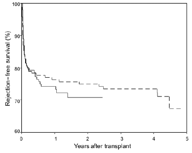 Figure 3. Kaplan-Meier estimate of rejection-free survival. The steroidavoidance group (solid line) and the maintenance group (dashed line) showed similar experiences with regard to rejection-free survival at 1 and 2 years (P = .64, log rank).