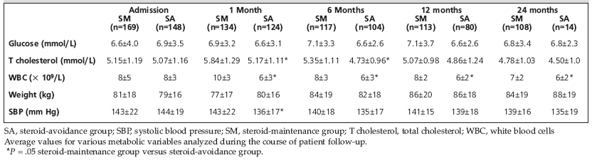 Results: One-year allograft survival rates, rejection-free graft survival rates, and patient survival rates were 88%, 76%, and 97%, respectively, in the steroid-maintenance group compared with 90%, 74%, and 96%, respectively, in the steroid-avoidance group (P = NS). No differences were detected in multiple secondary variables related to the metabolic effects of steroid therapy.