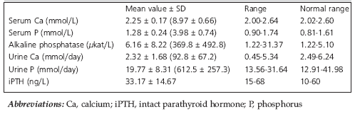 Results: The mean hemoglobin level was 135.6 ± 17.7 g/L, the mean serum creatinine level was 105.0 ± 15.3 µmol/L, and the mean serum calcium and phosphorus levels were 2.25 ± 0.17 mmol/L (normal range, 2.02-2.60 mmol/L) and 1.28 ± 0.24 mmol/L (normal range, 0.81-1.61 mmol/L), respectively. The mean serum intact parathyroid hormone level was 33.17 ±14.67 ng/L (normal range, 10-60 ng/L). Mean 24-hour urine calcium and phosphorus values were 2.32 ± 1.68 mmol/day (normal, 2.49-6.24 mmol/day) and 19.77 ± 8.31 mmol/day (normal, 12.91-41.98 mmol/day), respectively. A positive correlation was found between serum calcium and alkaline phosphatase levels (r = +0.71, P = .006). Hemoglobin level was negatively correlated with serum phos­phorus level (r = –0.65, P = .003) and sex (r = –0.57, P = .003) and positively correlated with urine creatinine levels (r = +0.69, P = .001).
