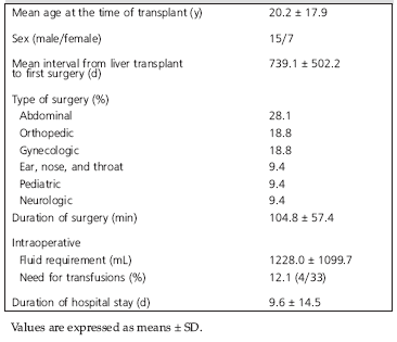 Patients and Methods: The medical records of 22 recipients of an orthotopic liver transplant who had undergone a total of 32 nontransplant elective surgeries between December 1988 and February 2006 were retrospectively reviewed. Demographic information, including the anesthetic management and the results of perioperative liver and renal function tests, was recorded.