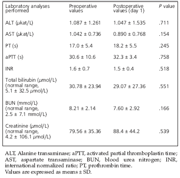 Crystalloids were administered as maintenance fluids. Intraoperative blood loss in 4 patients was compensated for by transfusions of 425.0 ± 236.3 mL (range, 100-600 mL) of packed red blood cells. No intraoperative complications occurred, and vasopressors were not needed in any patient. After thoracotomy and stereotaxic biopsy, 2 patients (9.1%) were admitted to the intensive care unit to treat an intracranial abscess. Serum levels of alanine transaminase, aspartate transaminase, prothrombin time, activated partial thromboplastin time, international normalized ratio, total bilirubin, blood urea nitrogen, and creatinine were similar preoperatively and on the first day after surgery (P > .05) (Table 2). Graft rejection occurred in 3 patients before their nontransplant surgery was performed. No patient died while hospitalized for nontransplant surgery.