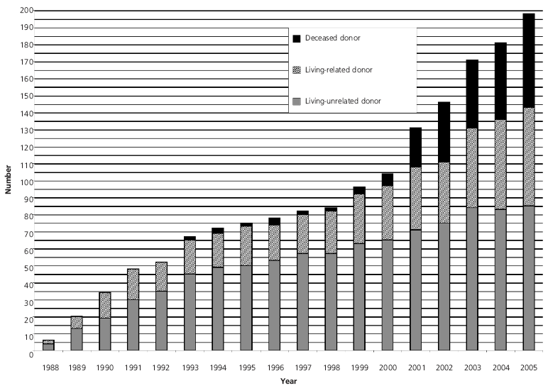 Figure 2. Number of renal transplants performed at the Shiraz Organ Transplantation Center between 1988 and 2005.