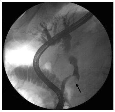 Endoscopic retrograde cholangiopancreatography is crucial to the evaluation of jaundice following liver transplant. We report a case of recurrent hepatocellular carcinoma 15 years after orthotopic liver transplant, presenting initially as obstructive bile duct compression as detected by cholangiogram(Figures 1 and 2). Laparotomy revealed hepatocellular carcinoma invading the common bile duct.