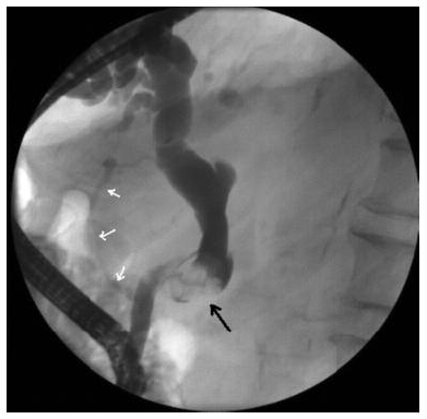 Figure 2: Intraluminal mass invasion appearing like common bile duct stones (black arrow), patent pancreatic duct (white arrows)