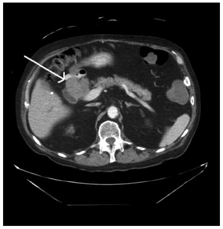 During laparotomy, a mass was found in the retropancreatic and paraduodenal regions, which invaded the bile duct. Following resection of the mass, continuity of the bile system was established via a Roux-en-Y hepaticojejunostomy. The patient’s postoperative course was uneventful. Final histology revealed hepatocellular carcinoma invading the common bile duct. An intraoperative liver biopsy specimen showed no evidence of cirrhosis. At 1-year follow-up, there was no clinical or radiologic evidence of hepatocellular carcinoma; the patient’s alpha fetoprotein level was < 4.8 ng/mL.