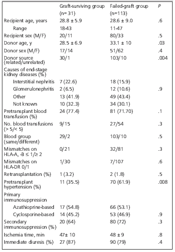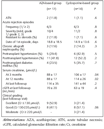 Results: Fourteen patients were treated with cyclosporine, while 17 patients had primary immunosuppression with azathioprine-based regimens. Episodes of acute rejection occurred in 17 patients (58%), 7 of these experienced 2 or more episodes. At most-recent follow-up, the mean serum creatinine level was 132 ± 44 µmol/L . Four patients were assessed by graft biopsy 15 or more years after the transplant, revealing 2 cases of mild glomerulosclerosis and 2 cases of moderate chronic allograft nephropathy. The most common complication was hypertension (54%). The independent determinants of long-term graft survival were donor age and source, hypertension both before and after renal transplant, and histopathological findings of chronic allograft nephropathy.