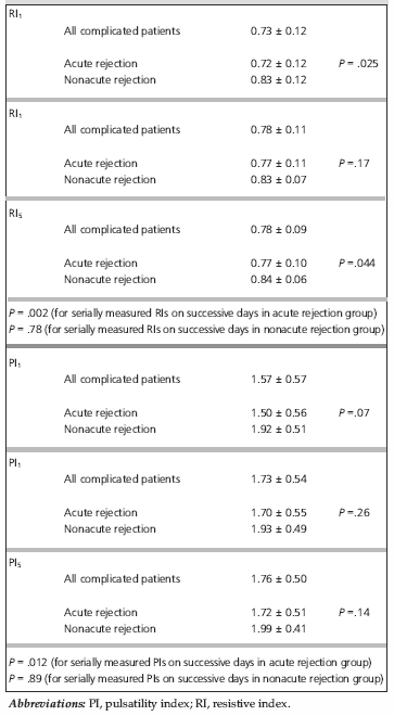 Table 3. Comparison of mean RI and PI values in complicated acute rejection and complicated nonacute rejection groups.