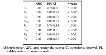 To evaluate the efficacy of RI and PI in differentiating complicated from noncomplicated allografts, we used the ROC curve analysis (Figure 1). The AUC of each variable was calculated (Table 4).