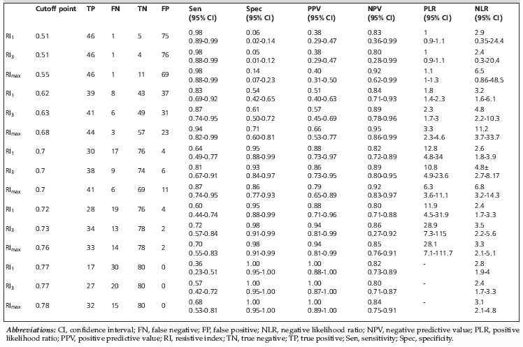Table 5. Efficacy of different cutoff points of resistive index.