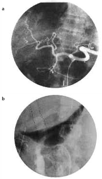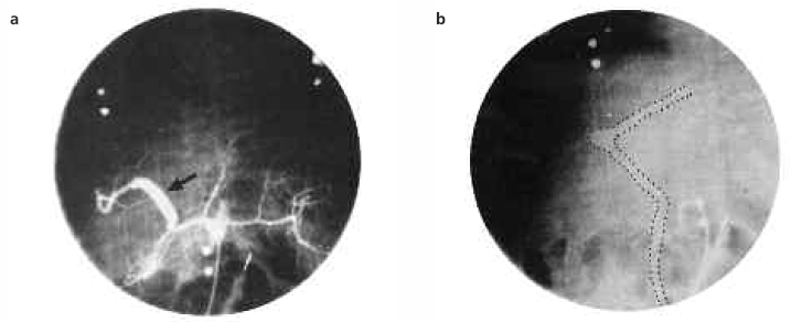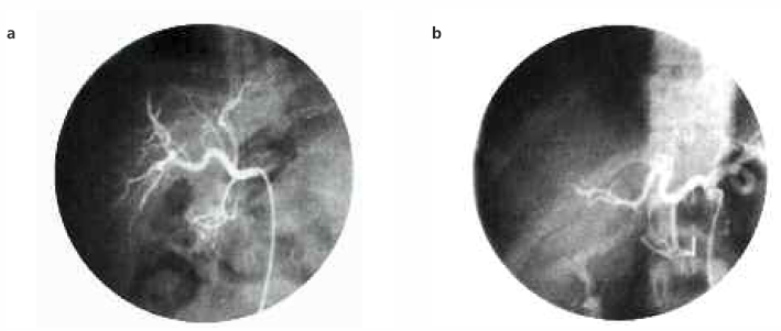 Postoperative immunosuppression consisted of triple drug therapy, namely 2 mg/kg/day azathioprine administered intravenously, with 2.5 mg/kg/day prednisolone and 3 mg/kg/day cyclosporine also administered intravenously. The early postoperative day was uneventful. The child began to recover. Unfortunately, on the third postoperative day, cerebral edema developed, and the liver functions began to show signs of deterioration as well. Therapy with OKT3 2.5 mg/day was started and continued for 5 days. After some improvement of liver functions, progressive deterioration began again, and a hepatic angiogram was performed; this revealed the graft artery and portal vein to be patent (Figure 2a, b). Following severe cerebral edema, the patient became unresponsive to medical treatment. Progressive deterioration of brain and liver functions led to the eventual death of the child on the 14th postoperative day. The postoperative course of the donor was uneventful. A slight elevation of the bilirubin (total, 4.2 mg; direct 3.0 mg) occurred during the first 48 hours, but returned to normal within a couple of days (Table 1), and she was ready to be discharged on the seventh postoperative day. Three months after surgery, she became pregnant and is still doing well.